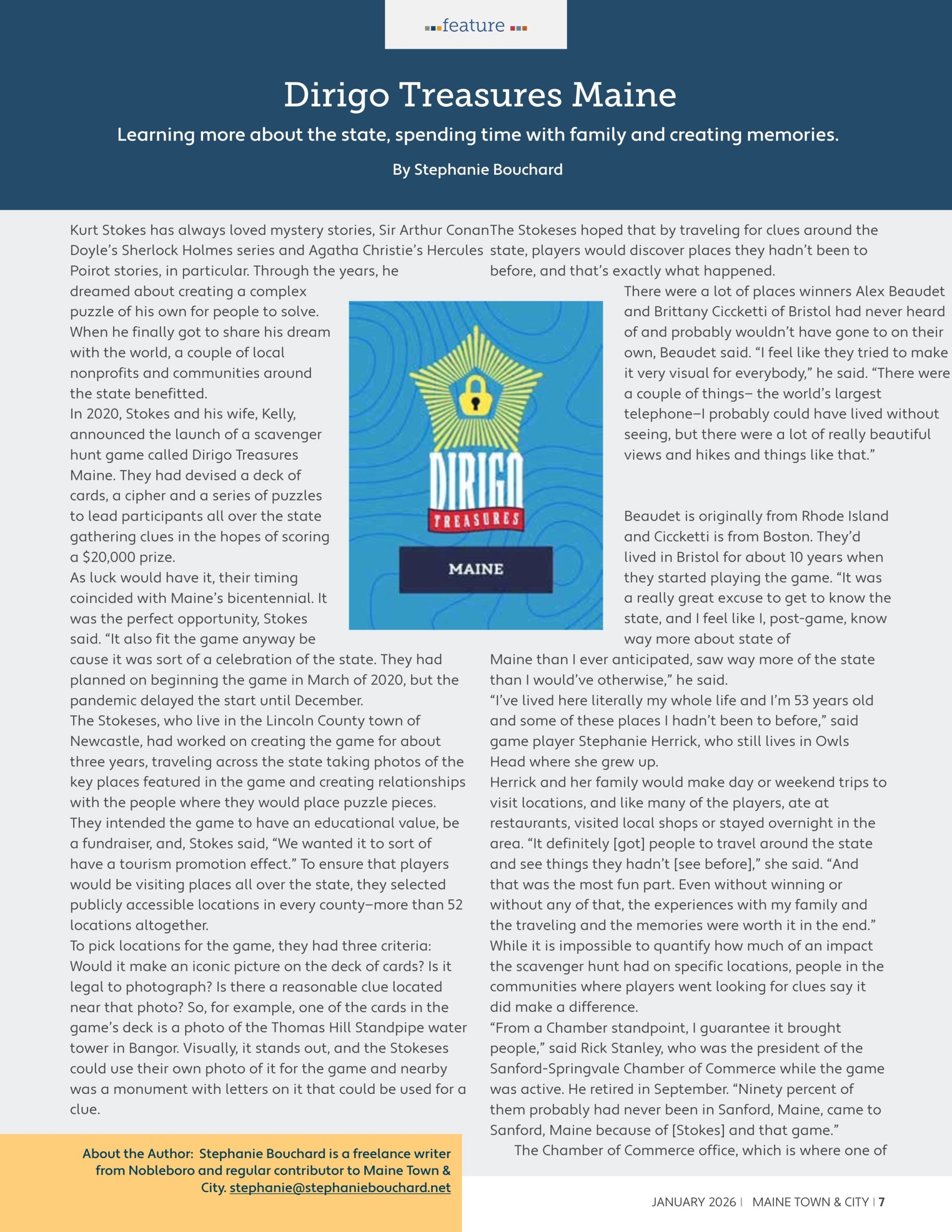 Hello All! We would like to take a moment to thank Maine Town & City Magazine for their feature article on Dirigo Treasures Maine in their recently released January 2026 issue. For those who would like to read the two-page article, please see images below as well as a link to the issue! —Kurt & Kelly Stokes, Owners – Dirigo Treasures, LLC
